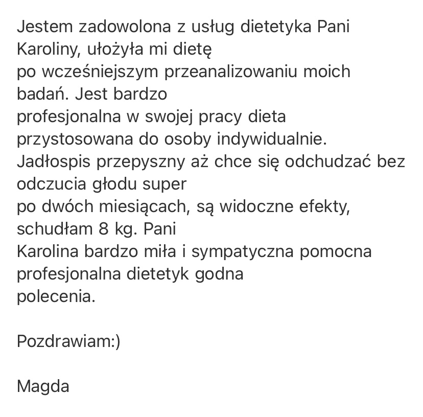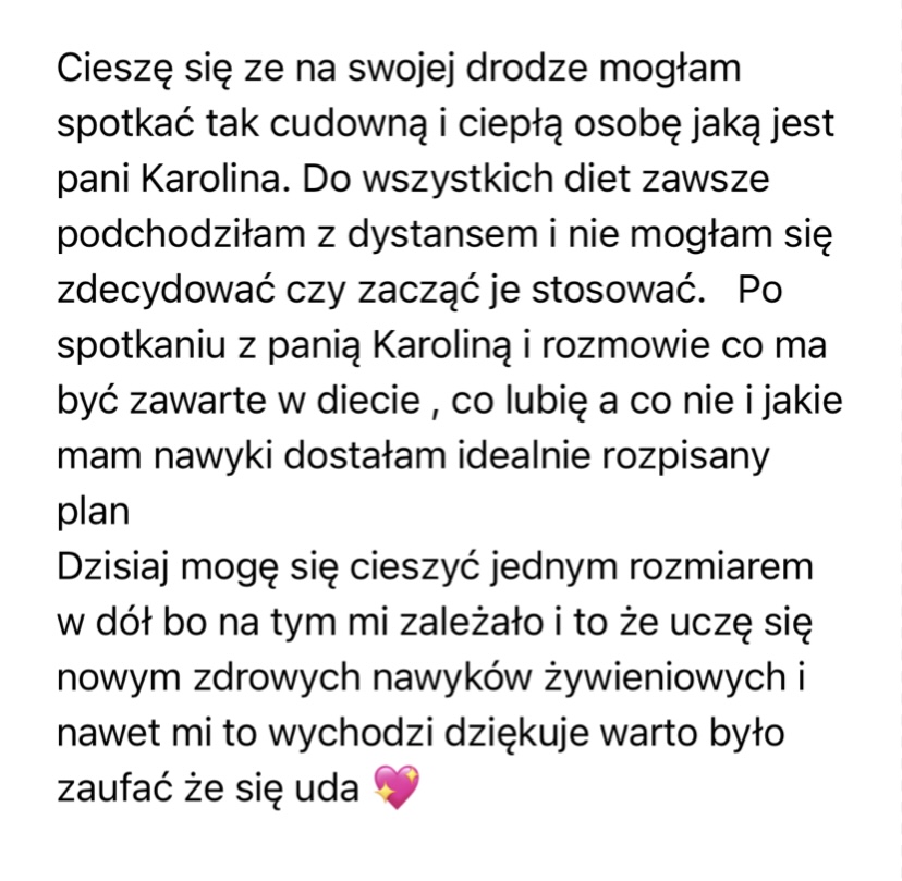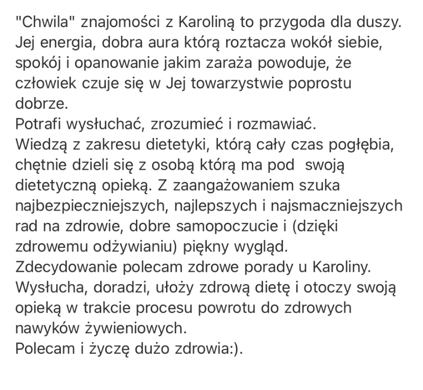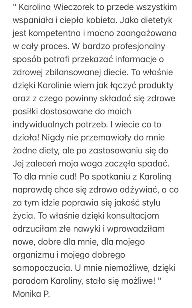 Moje klientki, tak o mnie mówią- „To właśnie dzięki Karolinie wiem jak łączyć produkty oraz z czego powinny składać się zdrowe posiłki dostosowane do moich indywidualnych potrzeb. I wiecie co to działa! Nigdy nie przemawiały do mnie żadne diety, ale po zastosowaniu się do Jej zaleceń moja waga zaczęła spadać. To dla mnie cud!” lub „Wyniki o niebo lepsze i samopoczucie doskonałe. Pełna energii jestem i wróciłam do